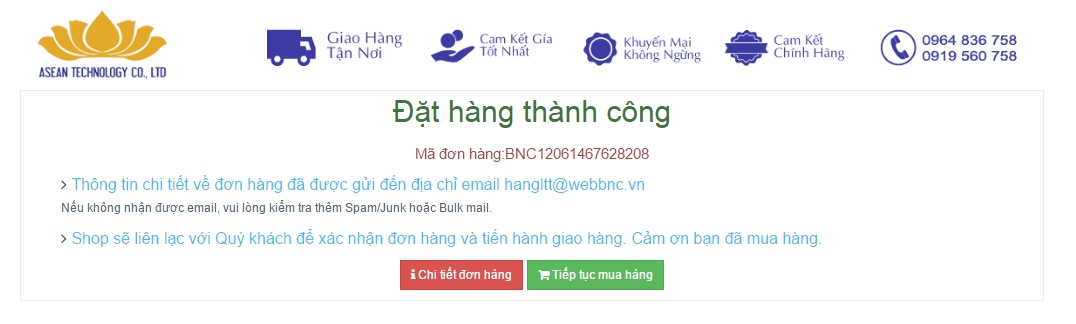 Quý khách tiến hành điền tiếp thông tin kiểm tra giá và Click vào Đặt hàng. Đặt hàng thành công, quý khách sẽ được thông báo: